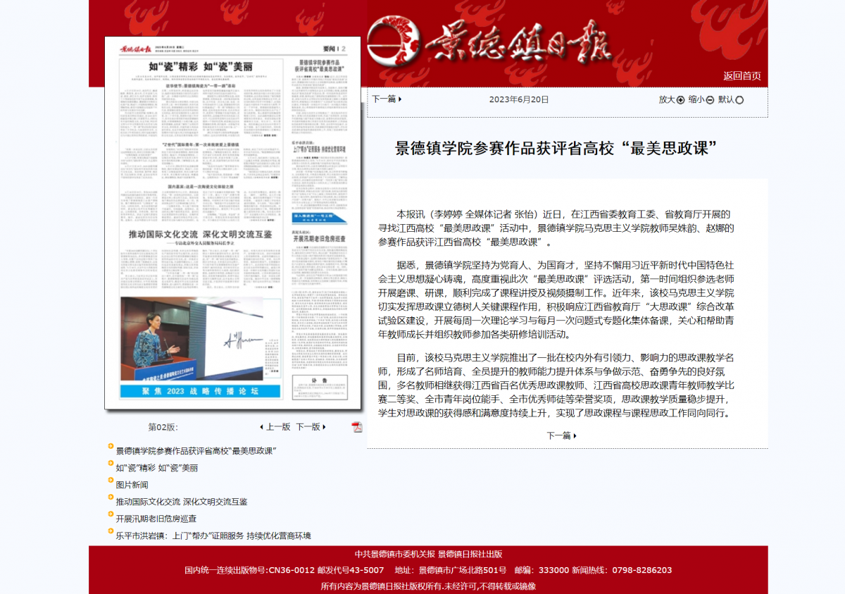 景德镇日报:景德镇学院参赛作品获评省高校“最美思政课”